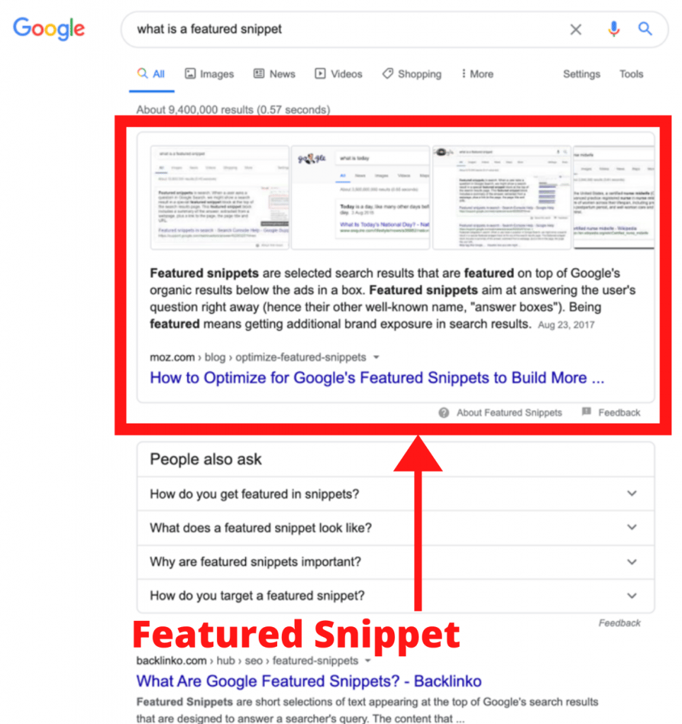 Google Snippets, or Featured Snippets, are answers Google pulls from websites to display at the top of the results page. They show up in different ways: